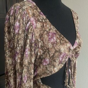 Features: Shiny lurex fabrication in a floral print design, deep V-neckline, tie-front detail, cutouts at the front and back, long billowy sleeves with cuffs, adjustable tie detail at back, lined
