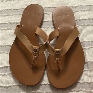 Experience the perfect blend of style and comfort with these Tory Burch tan sandals. Featuring a classic thong design and crafted in a warm tan hue, these sandals are ideal for casual summer outings. Their sturdy construction ensures durability for everyday wear.