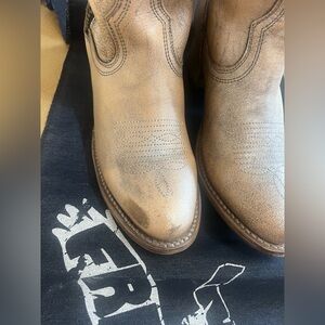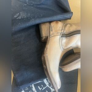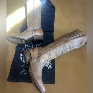 Gorgeous leather to-the-knee boots in a distressed taupe leather. New without the box, but stuffing socks, interior stuffing, and runner all come with them. Scarring is intentional to the distressed look. Full zip on the inset.