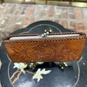 Beautiful vintage tooled leather wallet with floral embossing and intricate whipstitch edge detailing. Made from genuine calf leather. Features dual kiss-lock metal closures and classic accordion-style coin compartments. Interior has card slots and a snap pocket.