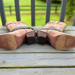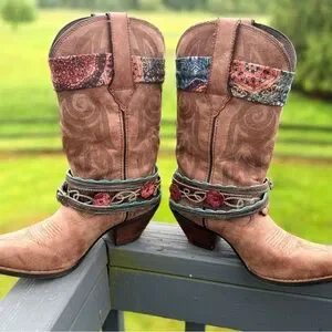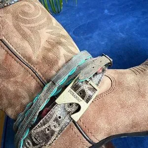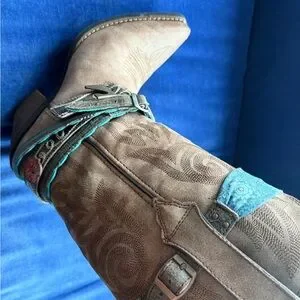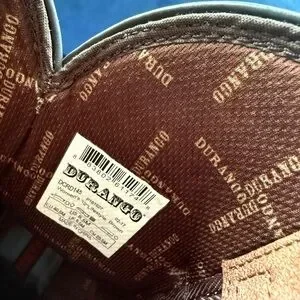 These Durango heeled boots showcase a rich brown leather construction with a classic Western silhouette. The boots feature intricate embroidered detailing on the upper shaft and a decorative leather strap with turquoise and silver embellishments. The angled heel and pointed toe design complete the timeless look.