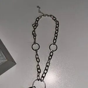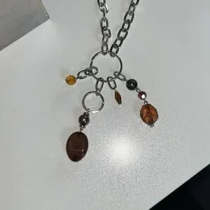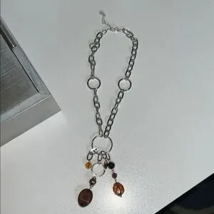 This striking necklace features a bold silver-toned chain with large oval links, complemented by warm brown beads that add a touch of natural elegance. The asymmetrical design and pendant-like dangles create a casual, bohemian vibe, making it a versatile accessory for any occasion.
