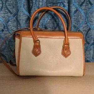 This vintage Dooney & Bourke London Tan and Cream All Weather Leather Satchel exudes sophistication with its structured silhouette and luxurious leather detailing. This convertible bag with handles or cross body strap features a harmonious blend of tan and cream tones, complemented by gold-toned hardware for a touch of classic allure. Perfect for any occasion, it combines timeless style with practical functionality. Minor wear as shown.