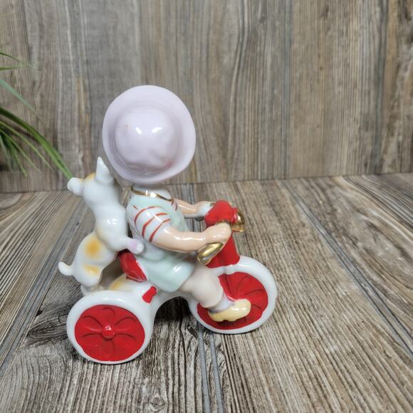 Sweet little figurine of a small Boy riding his puppy on a trike