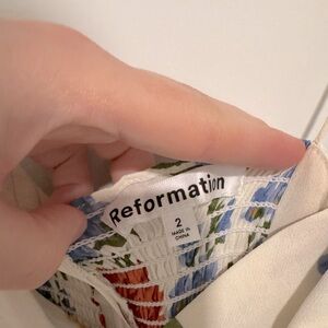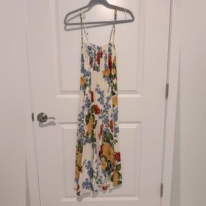 Step into effortless style with this Reformation slip maxi dress, featuring a vibrant yellow, blue, red, white and green floral color palette. Designed with spaghetti straps and a flowing silhouette, this sleeveless dress is perfect for resort wear or casual outings. The lightweight fabric ensures comfort and elegance in warm weather.