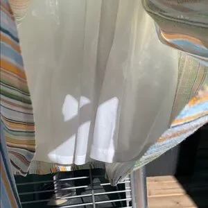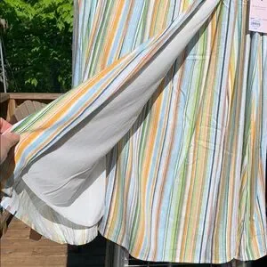 New with tags - attached tie, wrap style, fully lined, yellow, gold, navy, blue, green and brown are all colors of horizontal stripes.