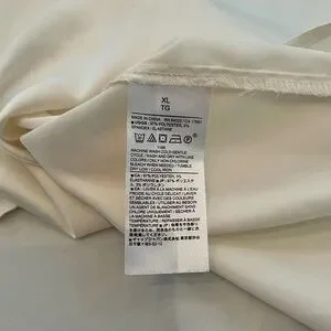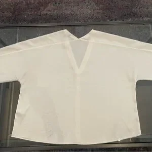 Float v-neck front and back. Dolman sleeves. Center front seam. Shoulder seams on back. Slight curved hem. 97% polyester, 3% spandex. Machine wash. Imported