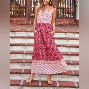 Perfect summer party maxi dress! Featuring breezy linen in mixed Indian block prints of lush florals. Fitted in the chest and loose in the body, this dress has adjustable straps which can be worn crossed or straight, pockets and size seam zipper. Only worn once!