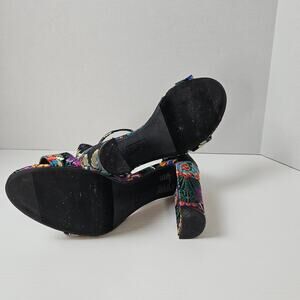 Brash Black Metallic Floral Brocade Print Open Toe Sandal Chunky Heal Size 6.5