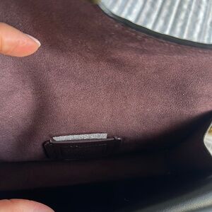 This elegant Coach clutch combines a sophisticated brown and cream color palette with a luxurious gold-tone clasp. The versatile design includes a wristlet strap, making it perfect for both casual outings and formal events.