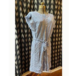 Lightweight blue and white stripe. Flattering scoop neck, button front, slight flutter cap sleeves. Full skirt hits at knee.