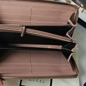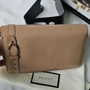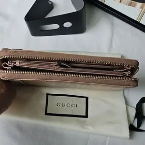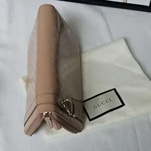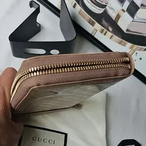 Excellent used condition Gucci Guccissima tan zippered wallet. This Gucci wallet features the iconic GG monogram canvas in a refined tan hue, accented by luxurious leather trim. The metallic silver hardware adds a sophisticated touch, making it an elegant accessory for any occasion. Its sleek design ensures both style and practicality. Callouts: 1 small pen mark on the front. Otherwise no rips, tear, zipper is zippy and has all original hardware and zipper pulls.