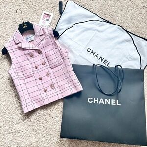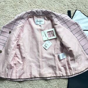 New with tag. In perfect new condition. Authentic Chanel. No alteration applied. Size 38. True to size S. Fits 36C cup nicely. Extra fabric and button included. Shopping bag, garment bag and hanger are all included. Pink and black. Made in France. 84% Wool. 9% polyamide, 3% polyester. 3% viscose. 1% metallic fiber. Lining- 65% cotton. 35% silk. Measurement- length 20”. Chest 17.5”. Shoulder 14”. Waist 15.75”. Bottom 17”. All buttons are intact.