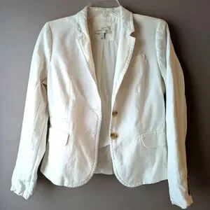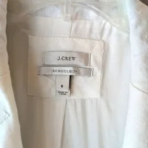 This J. Crew blazer in crisp white offers a tailored fit with a modern cut, perfect for both professional and casual settings. Its lightweight fabric ensures comfort and versatility, making it an essential addition to any wardrobe.