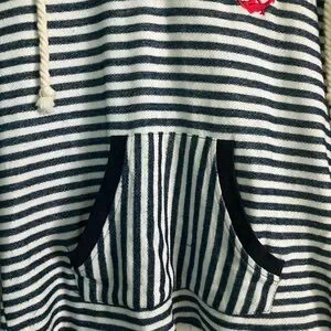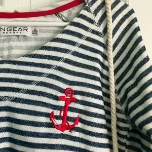 Nautical striped v-neck hooded sweatshirt with rope strings and red anchor. Perfect for summer nights on the boat or other casual outings. Barely worn. Like brand new.