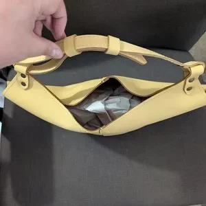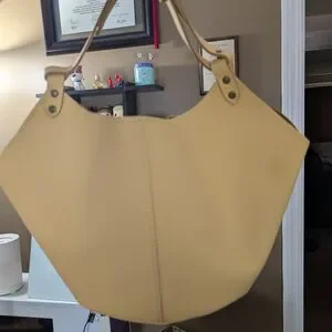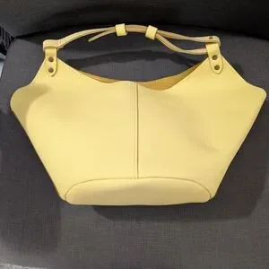 This creamy yellow shoulder bag features a spacious interior and a slouchy silhouette, perfect for carrying your essentials in style. Its minimalist design and smooth leather-like material make it a versatile accessory for any occasion.