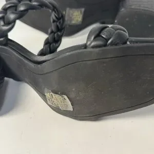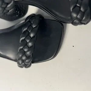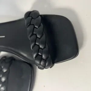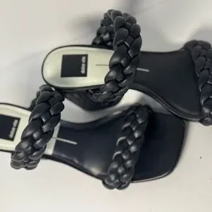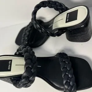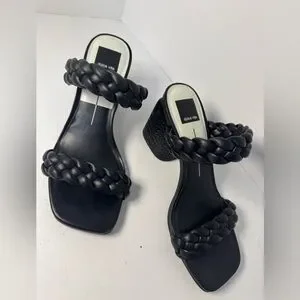 Elevate your style with these Dolce Vita black heels, featuring a distinctive braided strap design that adds a touch of texture and sophistication. The modern square-toe and open-back design make them a chic choice for any occasion. Crafted with attention to detail, these heels offer both elegance and comfort.