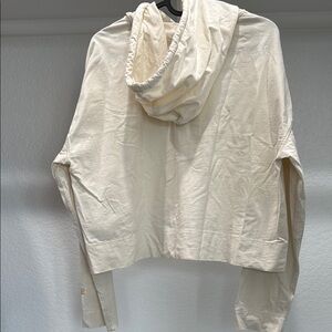 Soft off-white hoodie made from organic cotton. Ideal for everyday comfort. Super lightweight, more like a shirt than a hoodie. Apologies for wrinkles I had this folded and hung only for photos. Smoke free home. Maybe wore 3x. No signs of wear and tear, excellent condition. Fit is boxy cropped.