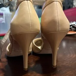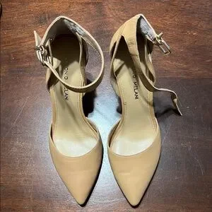 Step into elegance with these ANTONIO MELANI tan heels, featuring a classic pointed toe and a sleek medium height stiletto heel. Crafted from smooth material, they offer a timeless style perfect for formal occasions. The versatile tan color ensures they complement a wide range of outfits.