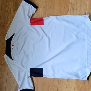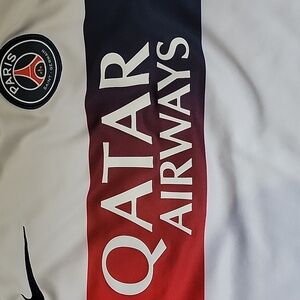Stylish Nike PSG jersey. White with bold red and navy stripe. Features Nike logo and Qatar Airways sponsor. This is a kids size medium.