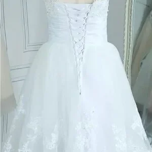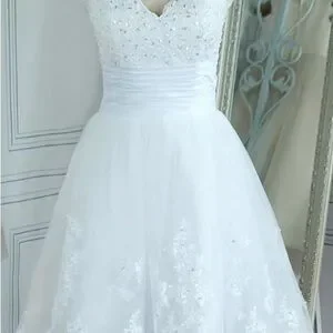 This stunning white wedding gown features a sleeveless design with a sweetheart neckline, perfect for a bride's special day. The A-line silhouette gracefully flows to the knee, creating an elegant and timeless look. Delicate lace detailing adds a touch of romance to this classic bridal dress.