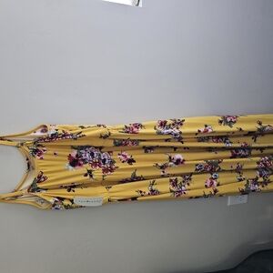 Vibrant yellow romper with red and black floral design. Perfect for a stylish look. Light material so it does breathe. Shorts underneath with a skirt attached to it. Any questions ask. Comes from a smoke free home. Will ship same or next day.