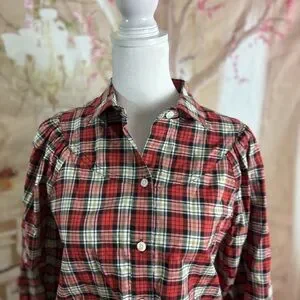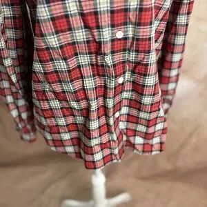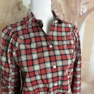 This relaxed button-down shirt from Alex Mill features a charming red and white color scheme with a peter pan collar. Its long sleeves and comfortable fit make it a versatile addition to any wardrobe.