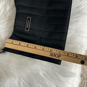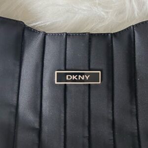 This DKNY nylon shoulder bag in classic black features a structured design with elegant vertical pleats, offering a chic and minimalist aesthetic. Its compact size and short shoulder strap make it a versatile accessory for any occasion, while the subtle metallic brand label adds a touch of sophistication.