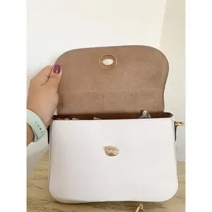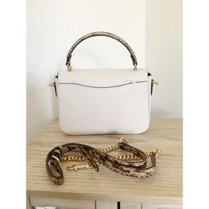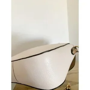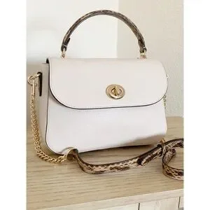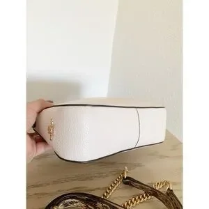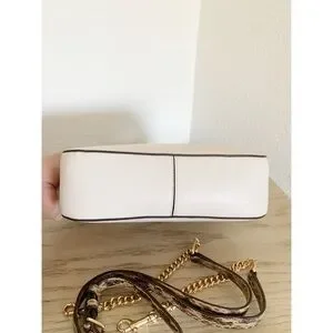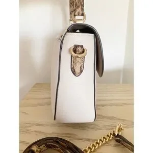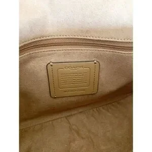 This Coach satchel in cream and gold exudes elegance with its structured design and gold-tone hardware. Featuring a top handle and a versatile crossbody strap, it offers both style and functionality for everyday use.