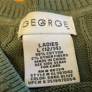 Stylish olive green cable knit tank top, size L (12/14). Perfect for layering or wearing alone. Armpit measurement is 19.5” across, rear top to bottom measurement is 18” long.