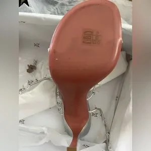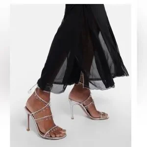 These exquisite size 40 EU Amina Muaddi heels showcase a shimmering silver hue, adorned with delicate crystal embellishments that dangle elegantly from the straps. The slim stiletto heel and intricate crisscross strap design provide a sophisticated touch, making them ideal for formal events.