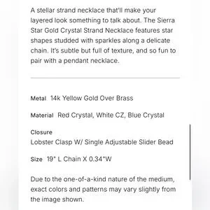 Elegant gold necklace featuring star-shaped accents in red, blue, and silver. Perfect for adding a touch of color and sophistication to any outfit.
