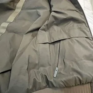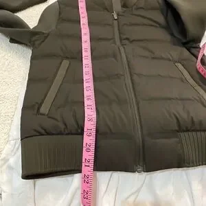 This is a beautiful jacket featuring scuba material arms, 2 zipper pockets on the outside and 2 zipper pockets on the inside. The filling is 90% goose down. It is in like new condition; no holes, tears, stains or pilling. Its lightweight construction makes it suitable for mild cold weather, ensuring you stay warm and fashionable.