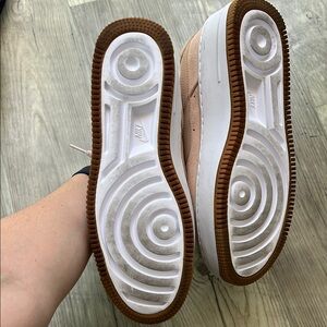 Experience the timeless appeal of Nike's Air Force 1 sneakers in a cream/pink hue. These sneakers feature a monochromatic leather upper, a signature swoosh logo, and a contrasting white midsole for a stylish look. Perfect for any casual outing, they offer both comfort and versatility.