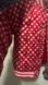 Stylish red quilted jacket with white polka dots. Features a character patch on the chest. Perfect for adding a fun touch to any outfit.