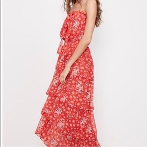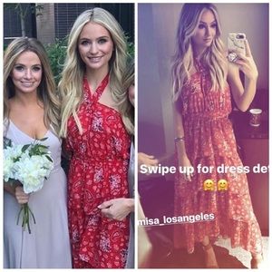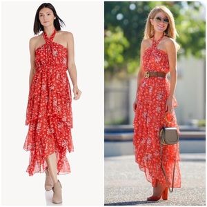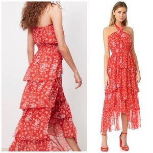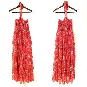 NEW MISA Los Angeles Halter Neck Ruffle Tiered Floral Maxi Dress Red Boho Summer