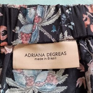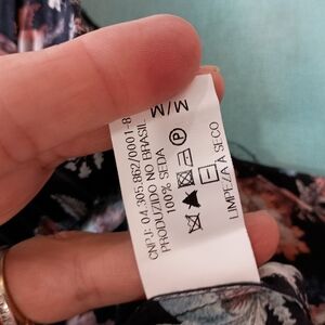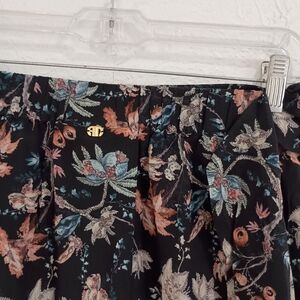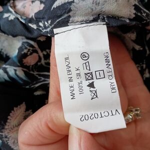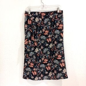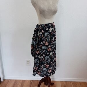 Unlined, 100% silk skirt in a black floral. A-line Midi length skirt with back elastic and a side tie.