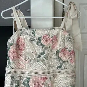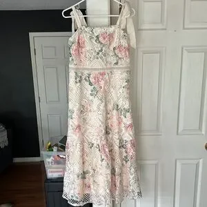 Elegant floral lace midi dress with pink and green accents. Perfect for special occasions. NWOT