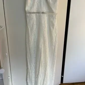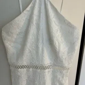 This stunning white lace jumpsuit by Lulu's is perfect for a bride seeking a modern yet elegant look. The halter neckline and sleeveless design offer a sleek silhouette, while the luxurious fabric ensures comfort and style for your special day. I wore this for 3 hours to my rehearsal dinner and it is in PERFECT condition!