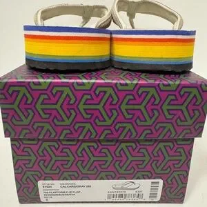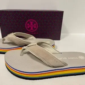 Chic Tory Burch flip flops in a neutral shade. Features a striking multicolor sole. Ideal for everyday style.