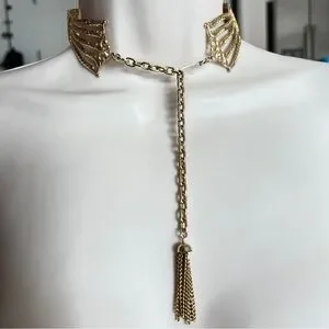 This exquisite vintage necklace features a luxurious Florentine gold finish (slightly matte) and a captivating multi-chainlike design. Its wide, woven texture adds a touch of elegance and sophistication, making it a standout piece for any occasion. Can be adjusted up to 6" extra - there is a chain with a tassel hanging to expand it from 11". The ends of the chains have an ornate detail. This can be worn with the tassel hanging at the front for another look. This is from my mom's boutique in Philadelphia back in the day, and I don't think it was ever worn. Model is virtual.