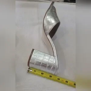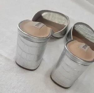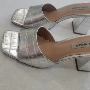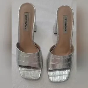 Elevate your style with these Steve Madden silver mules, featuring a sleek metallic finish and a modern square open toe design. The textured upper adds a touch of sophistication, while the flat sole ensures comfort for all-day wear. Perfect for adding a chic, minimalist touch to any outfit.