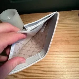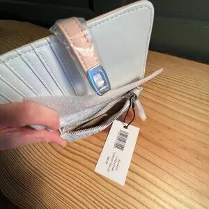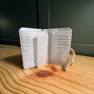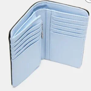 This turn-lock closure wallet boasts an interior white color. With multiple card slots, this wallet is perfect for keeping your essentials secure while on the go.
