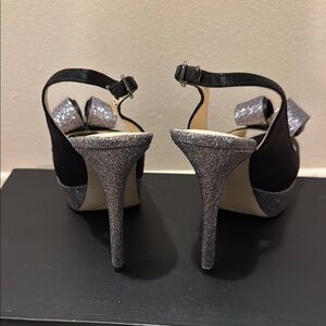 Elevate your evening look with these Enzo Angiolini heels, featuring a sleek black satin body and a sparkling silver accent on the toe snd heel. The elegant design includes a high heel and a secure sling back strap, making them perfect for formal occasions.