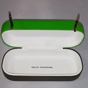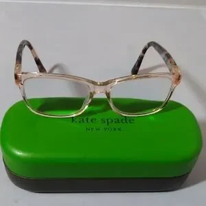 kate spade brand women's eyeglasses and case. Frames are light coral, bows are tortoise shell with goldtone spade logo. Cheaters are 3 strength, with blue light blocking coating. Case has a green top, black bottom with debossed logo. White interior with HELLO SUNSHINE. Reasonable offers welcome. Ships next business day.