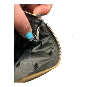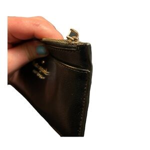 Sleek black card holder. Gold logo detail. Compact and stylish. All the seams are in great condition and not scratches on the outside. No rips on inside. Hardly ever used. Only imperfection is the top part of the zipper is gone.