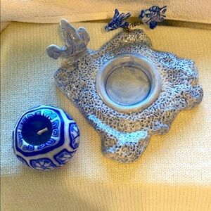 The image shows a handmade ceramic candle holder. It features a central, removable candle holder section with blue and white patterns, resembling traditional Chinese porcelain designs. This section sits atop a textured, irregular base, also in blue and white, seascape scene. The base includes two fish attached by springs, giving the impression of constant movement, and a coral shape on one side. This piece is impressive not only to collectors but sea and fish enthusiast alike.