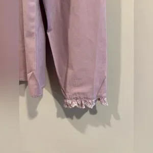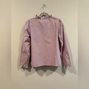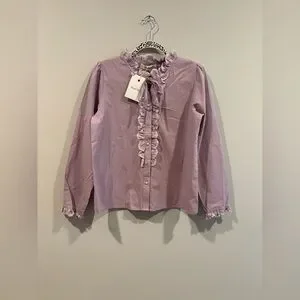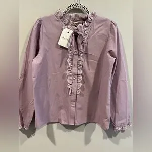 This elegant blouse showcases a soft pink hue, enhanced by charming ruffled details and a stylish tie front. The long sleeves and bib collar add a touch of sophistication, making it a versatile addition to any wardrobe.