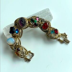 Big and chunky 50's double link bracelet has glass cabochons and rhinestones. If you are looking for attention this is it and it will put a smile on your face. It is 7.5 inches long with a fold-over clasp for a high end designer piece. The settings are in excellent condition. The security chain is missing. This is a rare and very collectable piece of jewelry.