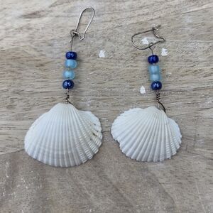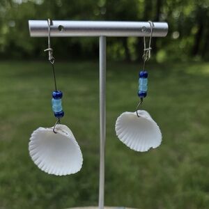 Elegant earrings featuring white shell accents and blue beads. Perfect for a beach-inspired look.